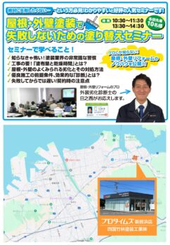 ●住まいの塗装リフォームってどこに頼んだらいいの?手抜きされないか心配!と悩んでいる方へ 「屋根・外壁塗装で失敗しないための塗り替えセミナー」を開催いたします。 ・知らなきゃ怖い!塗装業界の非常識な習慣 ご家族やご友人をお誘いの上お気軽にお越し下さい^^ |
